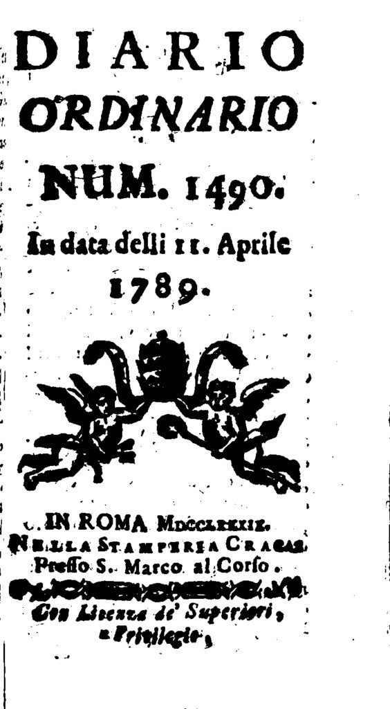 18. Diario ordinario, Roma, Stamperia Cracas, num 1462. In data delli 3 Gennaio 1789; num 1464. In data delli 10 Gennaio 1789; num. 1490. In data delli 11. Aprile 1789. Mancanti invece i numeri relativi alle annate del 1788.