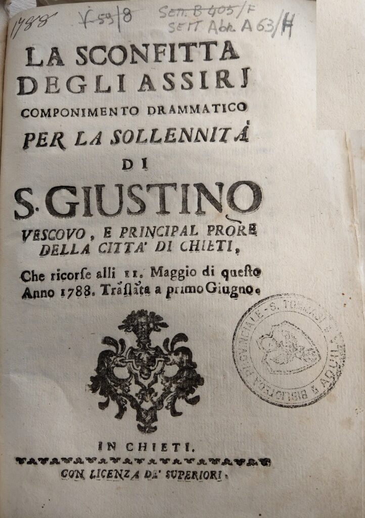 «LA SCONFITTA / DEGLI ASSIRI / COMPONIMENTO DRAMMATICO / PER LA SOLLENNITÀ [sic] / DI / S. GIUSTINO / VESCOVO, E PRINCIPAL PRO[TETTO]RE / DELLA CITTA’ DI CHIETI, / Che ricorse alli 11. Maggio di questo / Anno 1788. Traslata a primo Giugno. / IN CHIETI / CON LICENZA DE’ SUPERIORI»