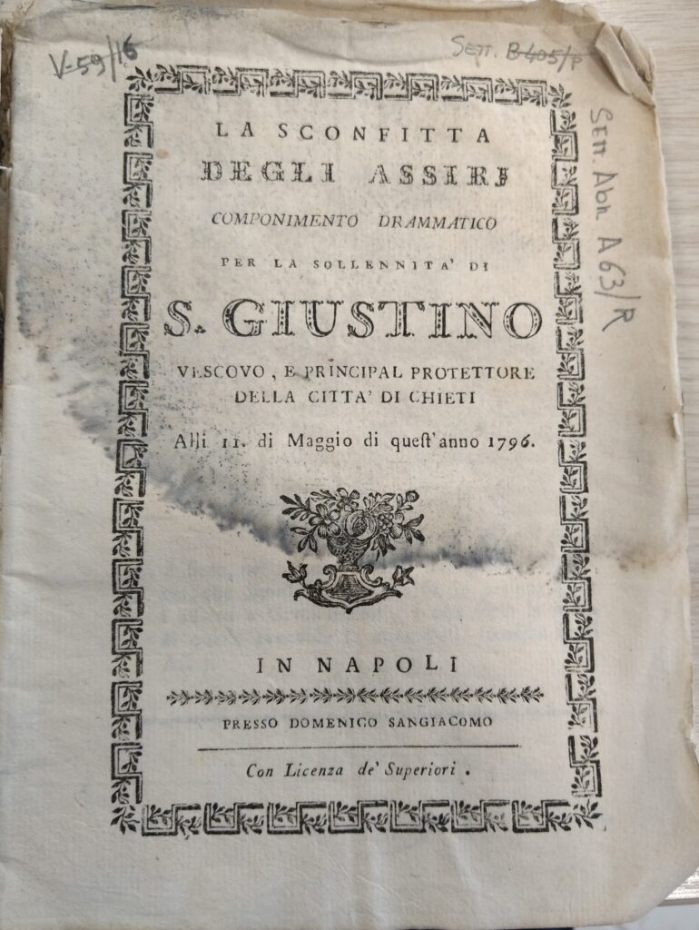 «LA SCONFITTA / DEGLI ASSIRJ / COMPONIMENTO DRAMMATICO / PER LA SOLENNITA’ DI / S. GIUSTINO / VESCOVO, E PRINCIPAL PROTETTORE / DELLA CITTA’ DI CHIETI / Alli 11. di Maggio di quest’anno 1796. / IN NAPOLI / PRESSO DOMENICO SANGIACOMO / Con Licenza de’ Superiori.»
