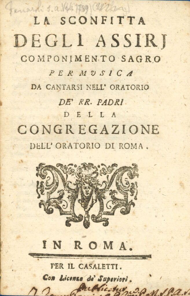 «LA SCONFITTA / DEGLI ASSIRJ / COMPONIMENTO SAGRO / PER MUSICA / DA CANTARSI NELL’ORATORIO / DE’ RR. PP. / DELLA / CONGREGAZIONE / DELL’ORATORIO / DI ROMA / IN ROMA / PER IL CASALETTI / Con Licenza de’ Superiori.»11