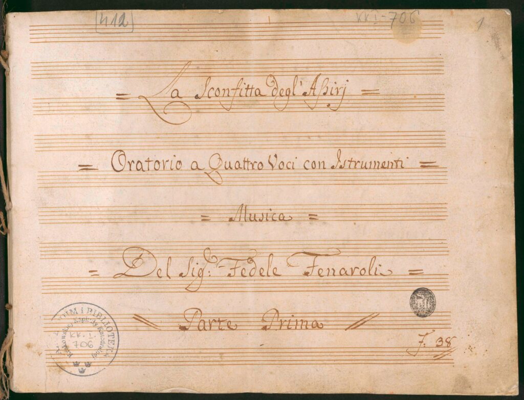 Nel 2001, la studiosa Anna Ryszka-Komarnicka dava notizia, in una rivista musicologica polacca, del rinvenimento di un fondo musicale di origine italiana custodito nell’Archivio Capitolare della Cattedrale di Cracovia (Cracow, Polonia). I brani musicali compresi nella raccolta erano oratori e altre composizioni sacre provenienti dalla Chiesa Nuova di Santa Maria in Vallicella di Roma. Le stesse erano state presumibilmente copiate, e comunque in seguito trasportate in Polonia, grazie ad un canonico polacco, Waclaw Sierakowski, ex componente dell’ordine dei Padri Filippini. Tra quelle opere sacre, era ed è tuttora presente una copia manoscritta della partitura de “La sconfitta degli Assiri” di Fedele Fenaroli24. Nel 2021 il manoscritto, di fattura tardo settecentesca, è stato digitalizzato e catalogato dal RISM, permettendone quindi la fruizione a studiosi e musicisti di tutto il mondo25.